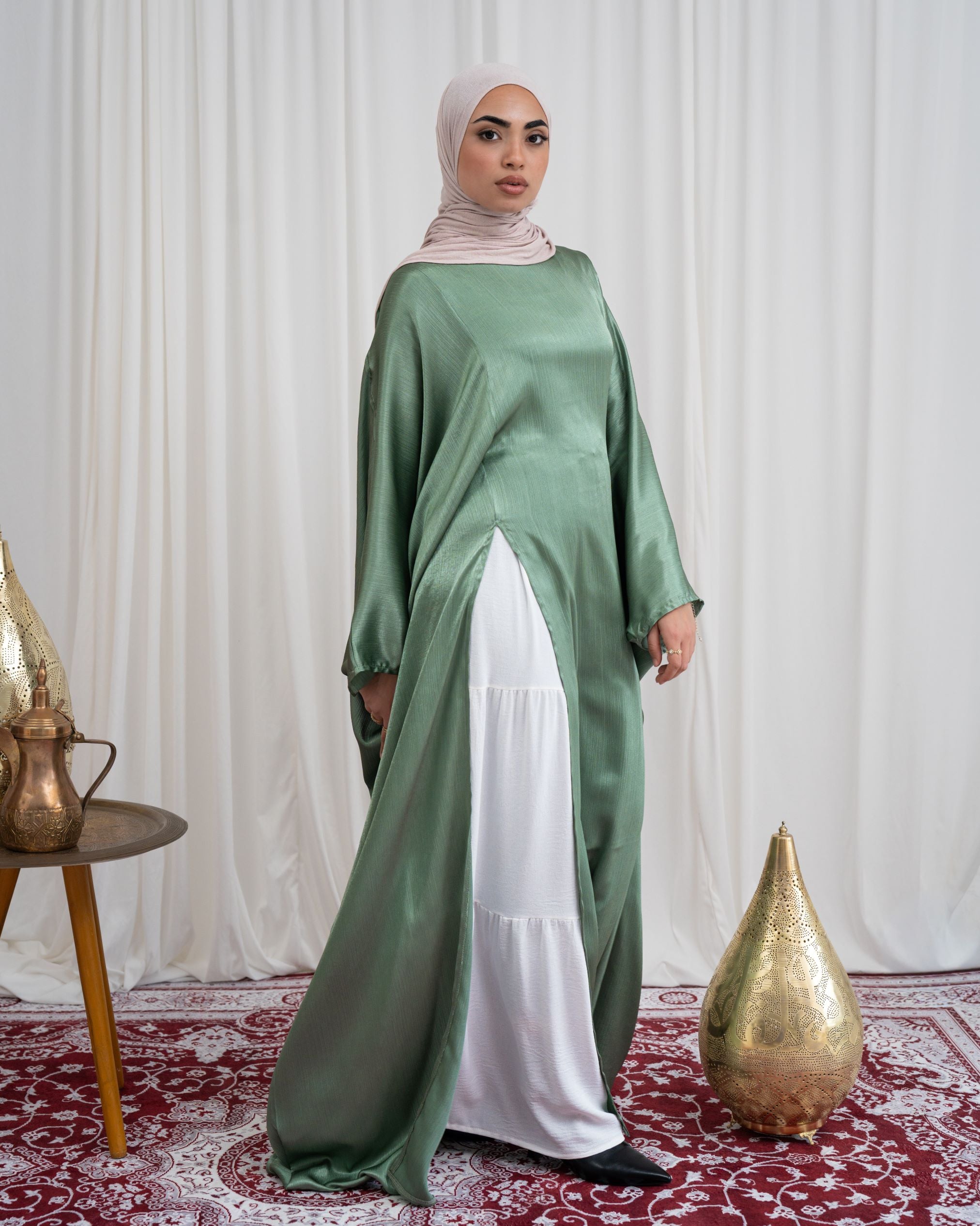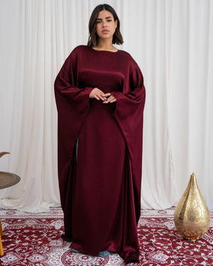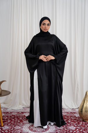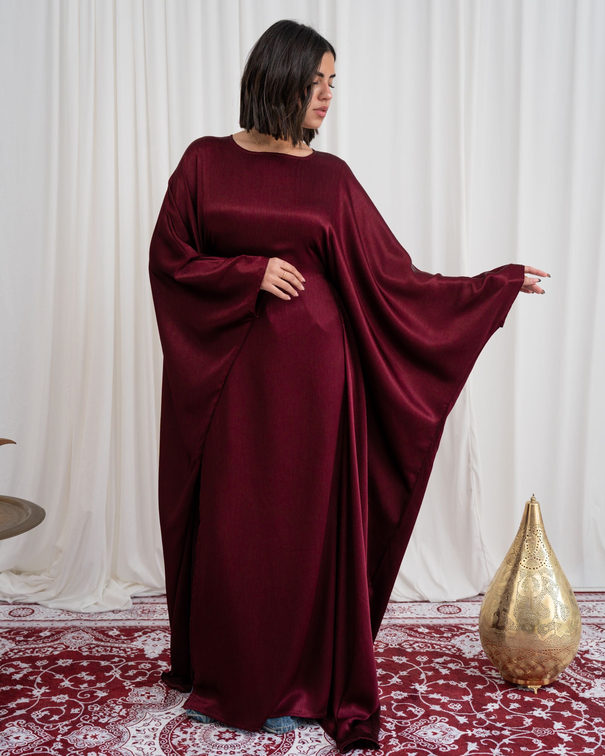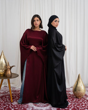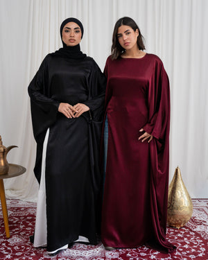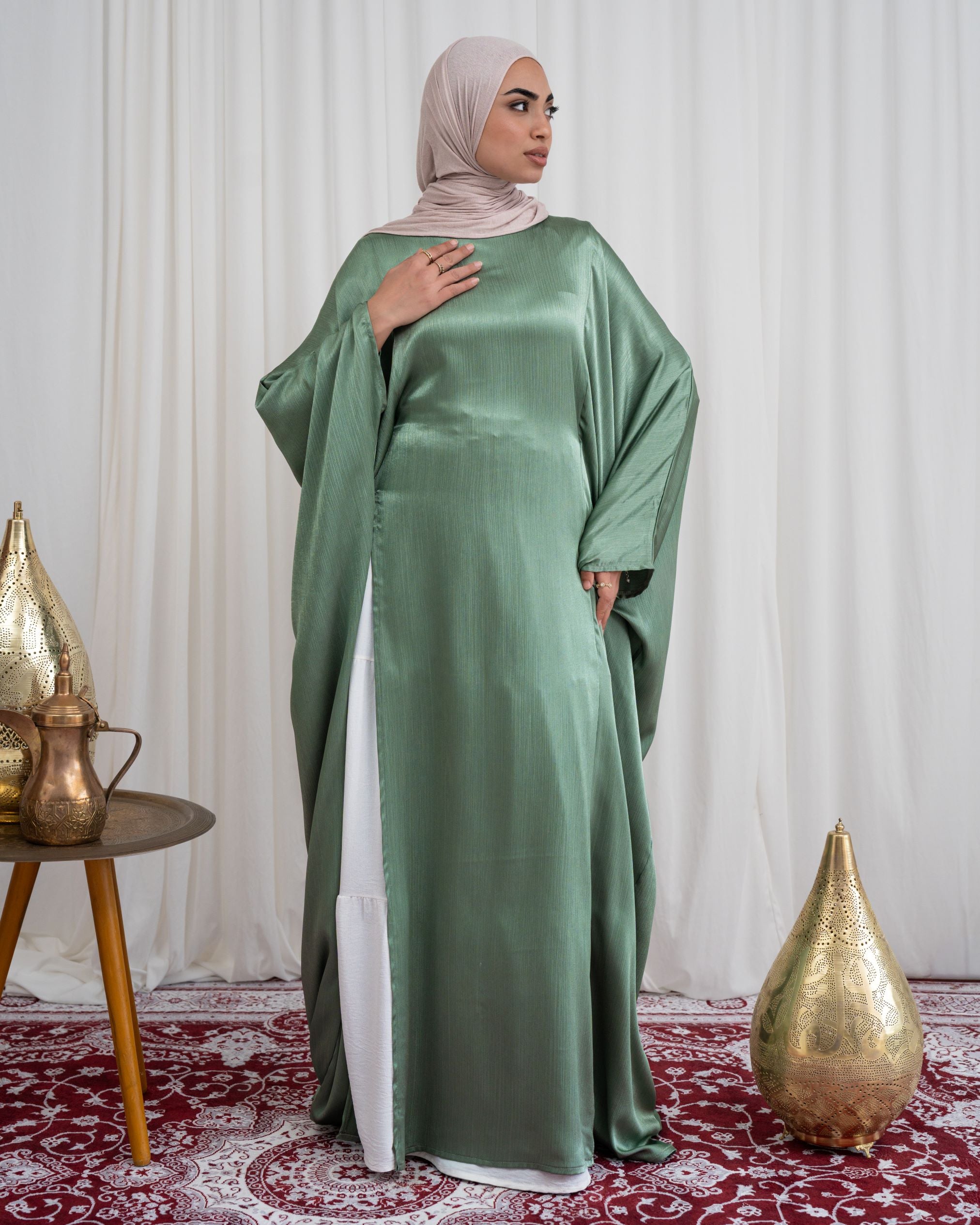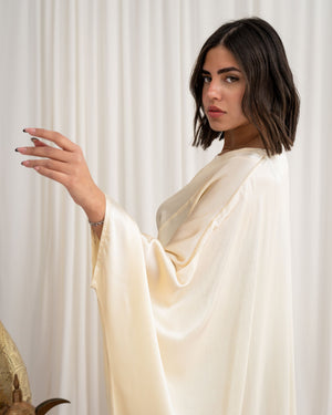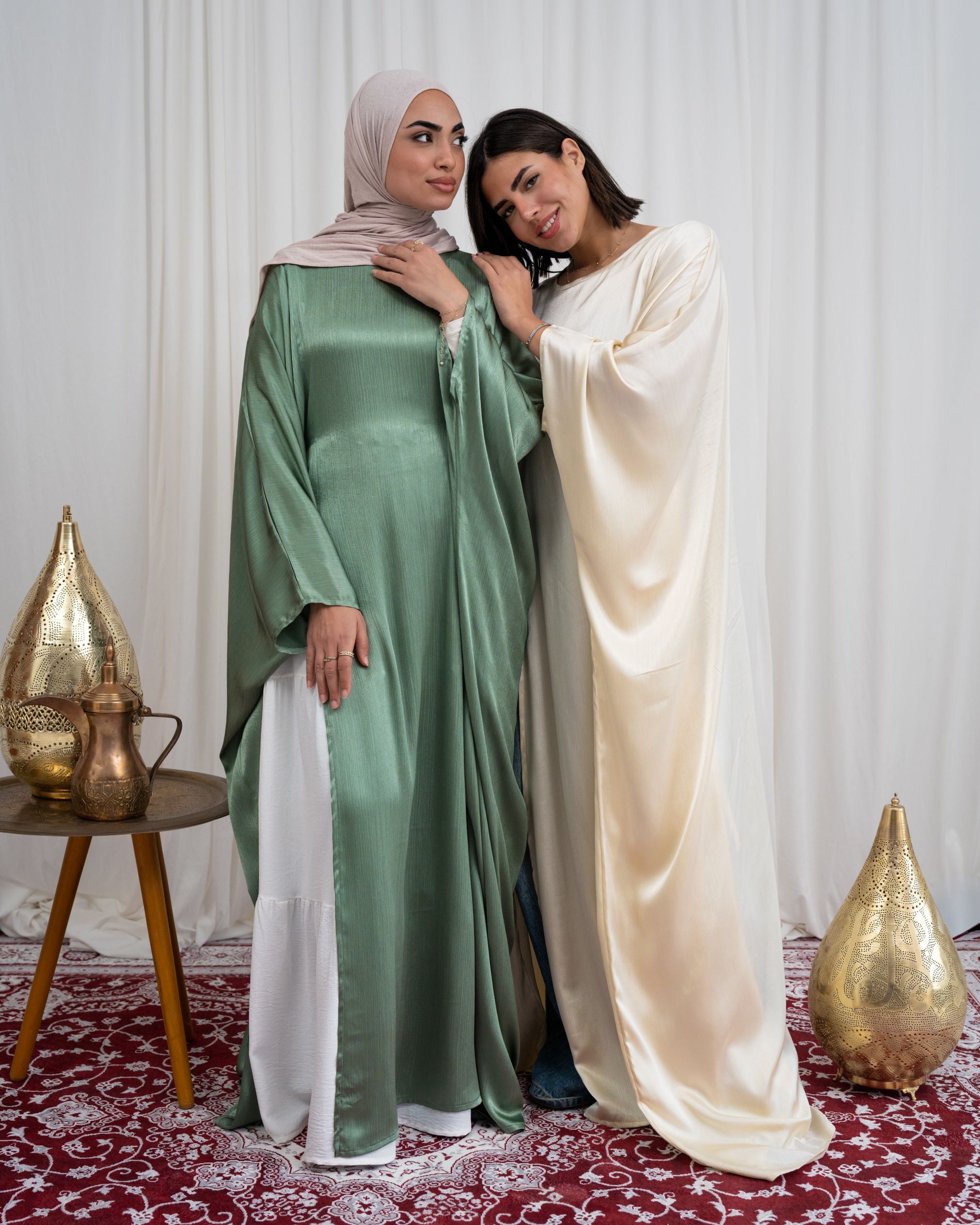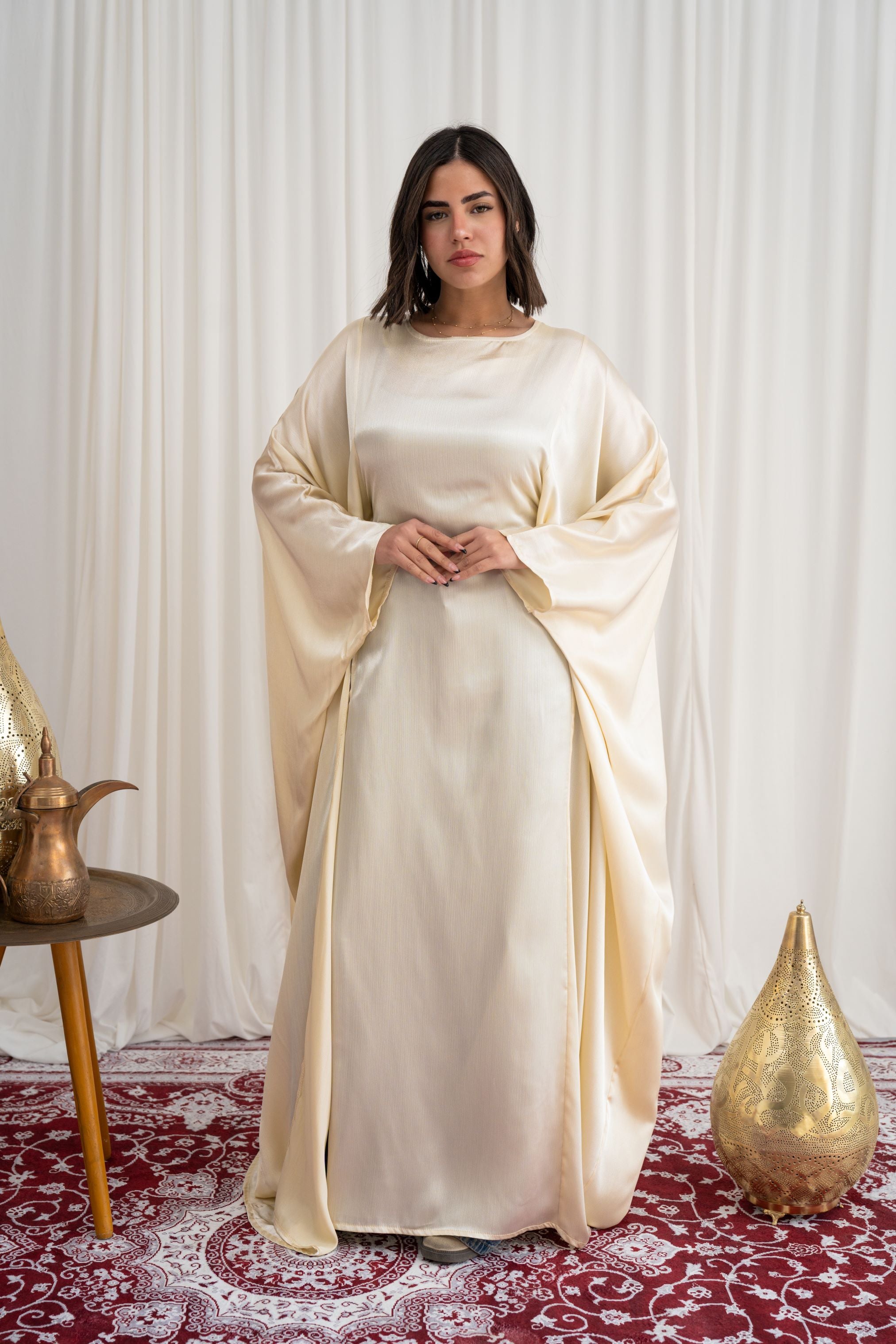 Experience the captivating glow of our Qamar Kaftan. Crafted from the finest Shimmer Satin, this piece reflects light beautifully, offering a luxurious luster and a silky-smooth touch for your most special nights.
