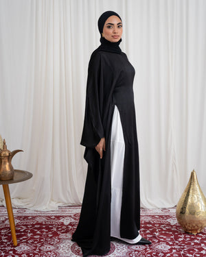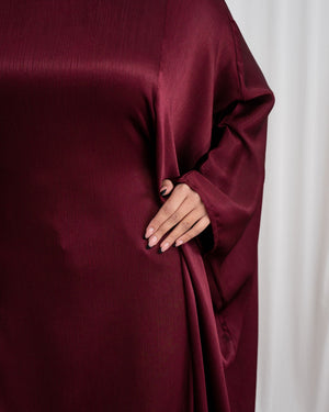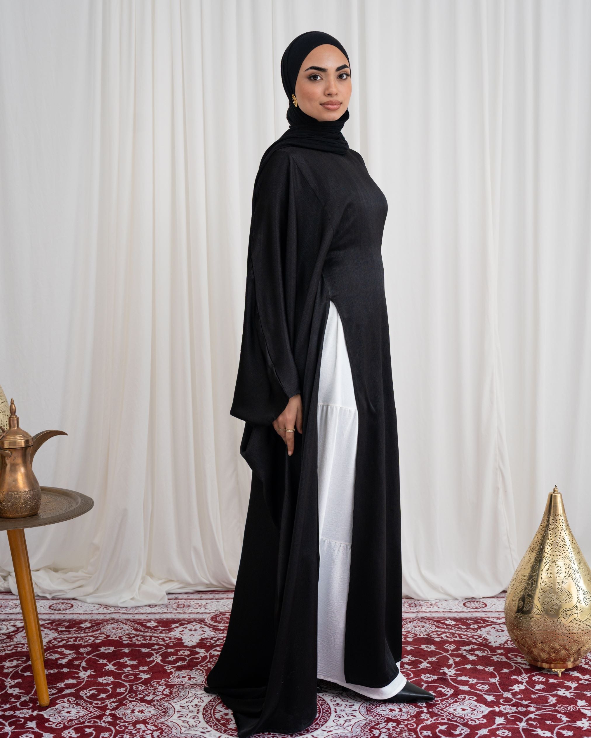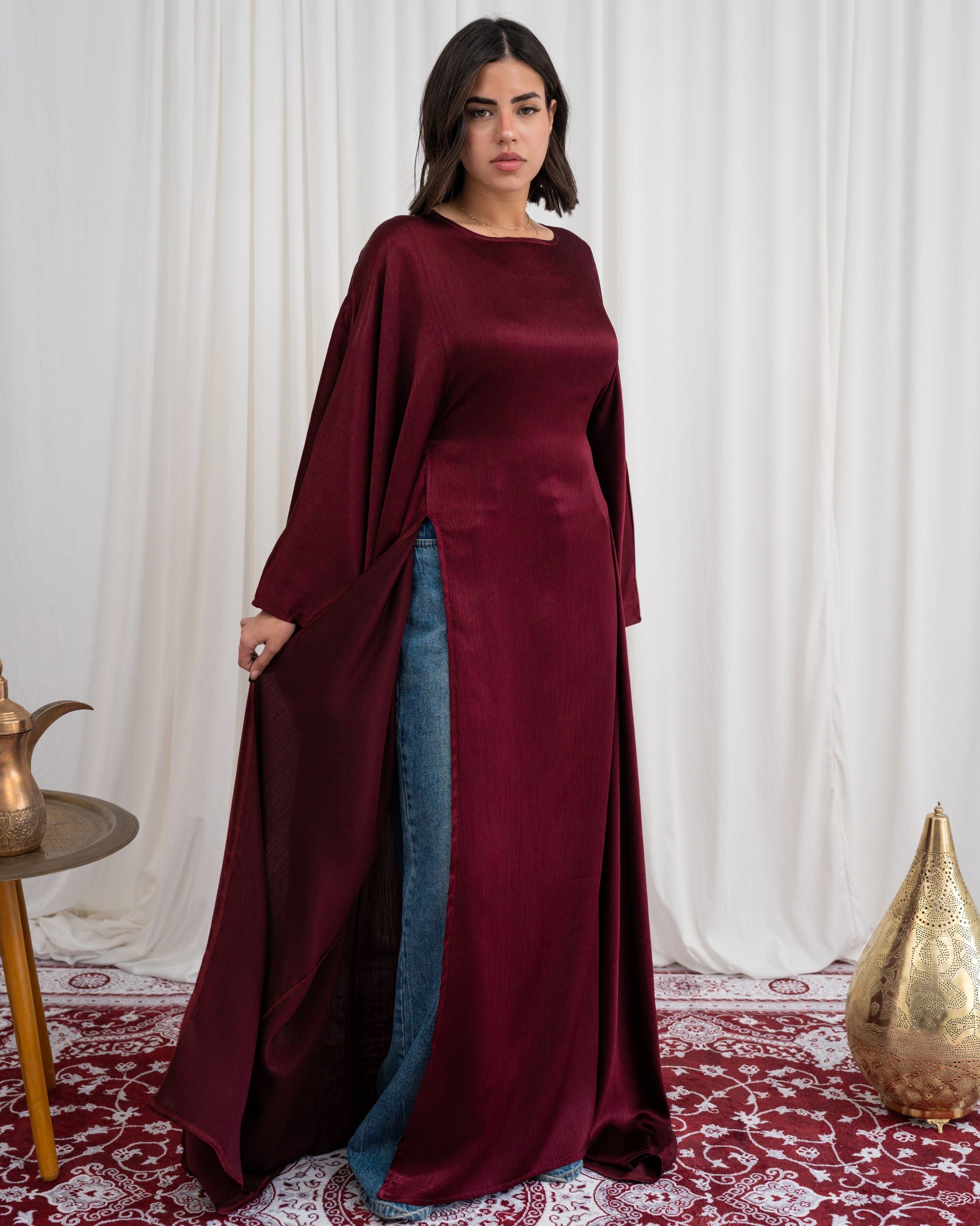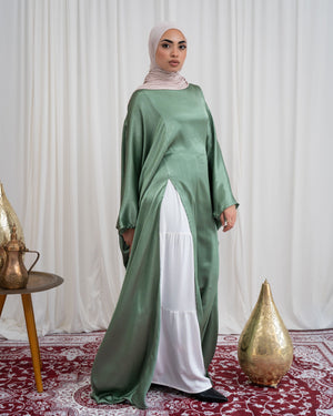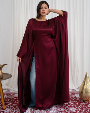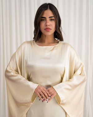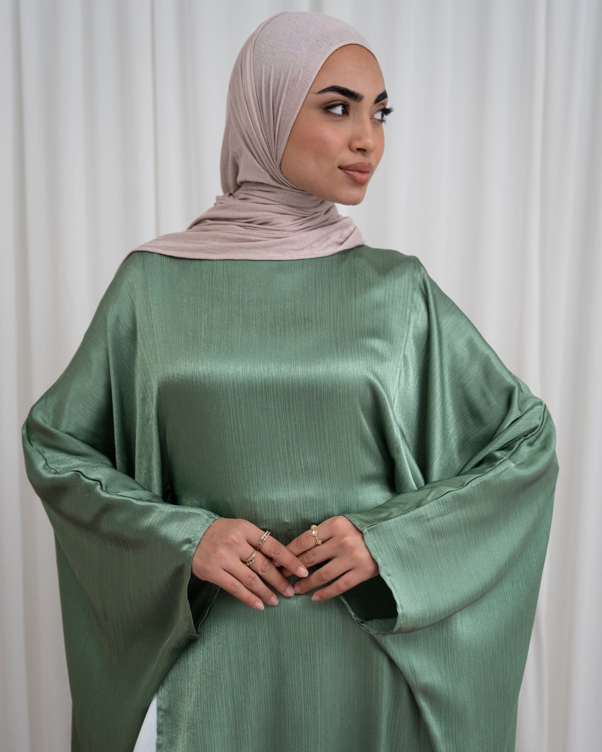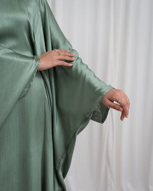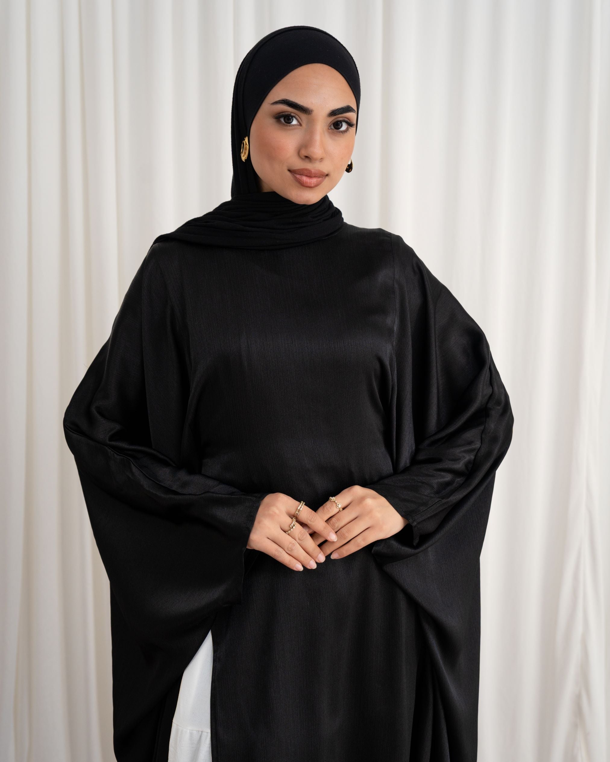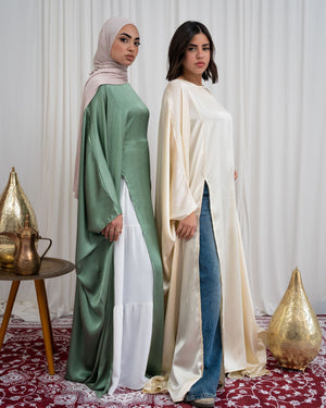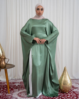 Experience the captivating glow of our Qamar Kaftan. Crafted from the finest Shimmer Satin, this piece reflects light beautifully, offering a luxurious luster and a silky-smooth touch for your most special nights.